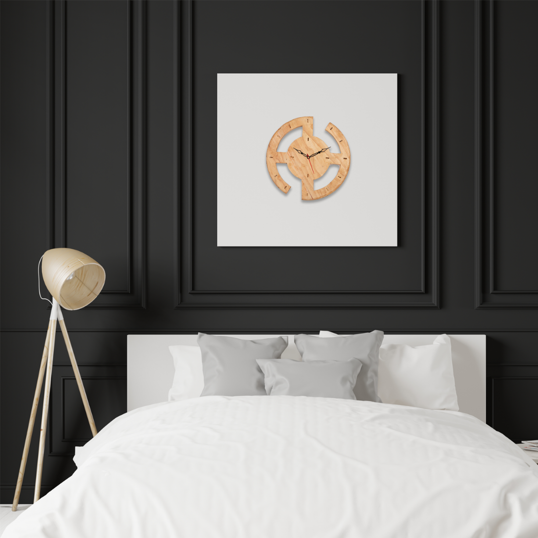 Unique geometric wooden wall clock with a natural finish mounted on a white canvas in a black paneled minimalist bedroom.Pallet wood double circle wall clock