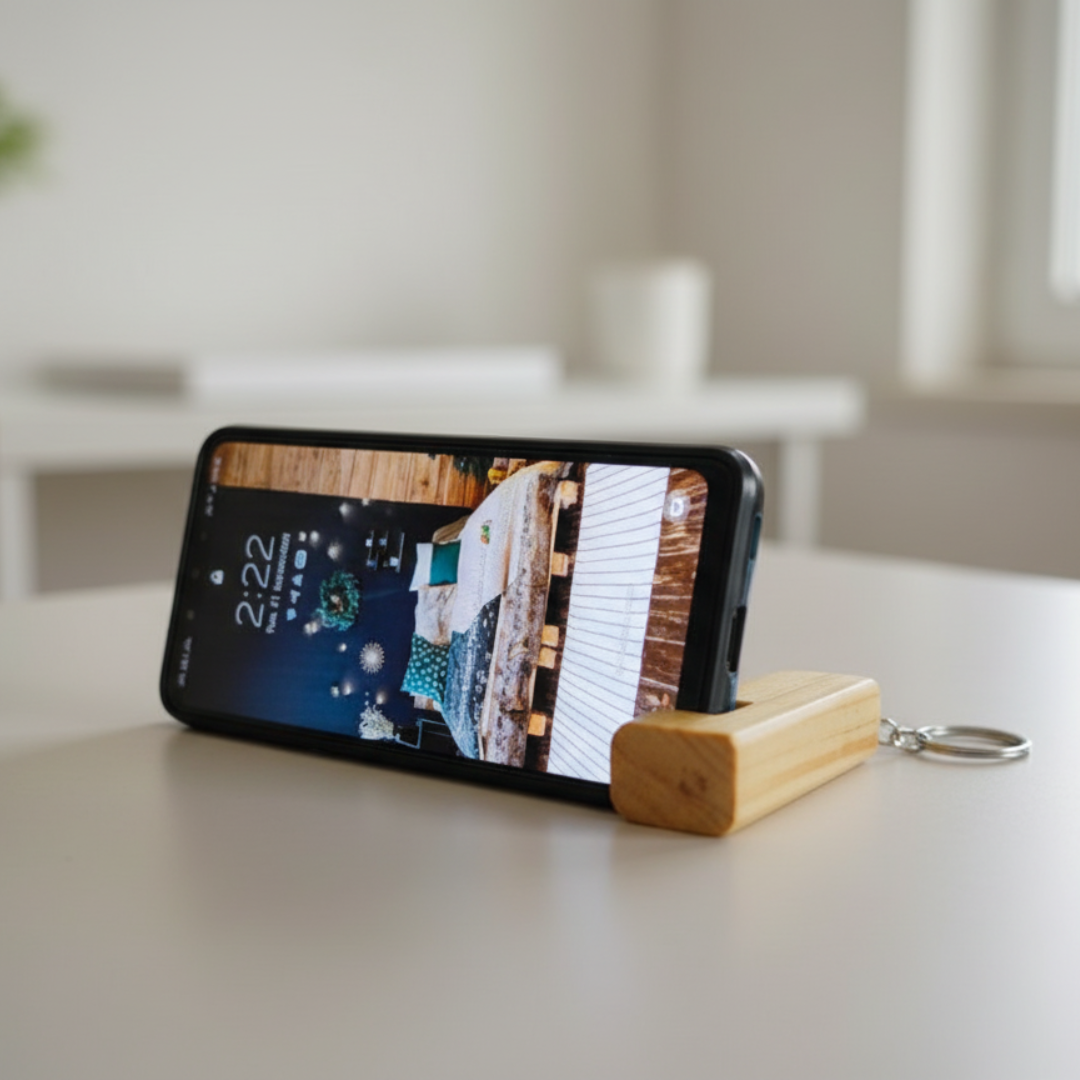 Wooden Keychain Mobile Holder – Practical & Stylish Desk Accessory Multifunctional DesignKeep your essentials organized with the Wooden Keychain Mobile Holder. This compact, stylish accessory serves as both a keychain holder and a mobile stand. It’s perfect for organizing your keys and holding your phone in place while you work or relax. Perfect for Hands-Free ViewingThis wooden phone holder is great for hands-free viewing. You can easily place your phone vertically or horizontally. Whether you’re watching videos, making video calls, or following recipes, this holder offers optimal viewing angles. Sustainable & DurableCrafted with high-quality wood, this holder is designed with sustainability in mind....