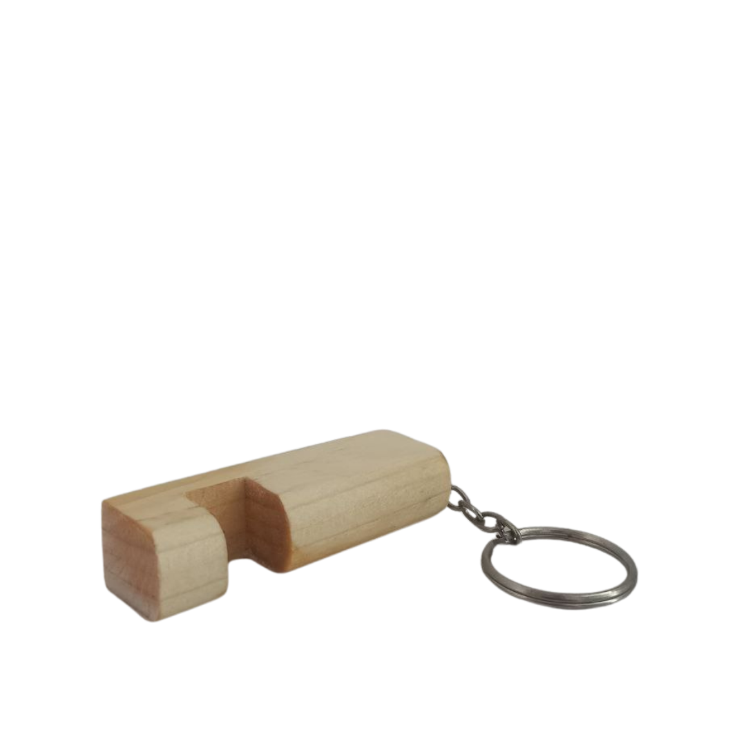 A small, handcrafted light wood keychain with a built-in slot to serve as a portable mobile phone stand, isolated on a white background.Wooden Keychain Mobile Holder