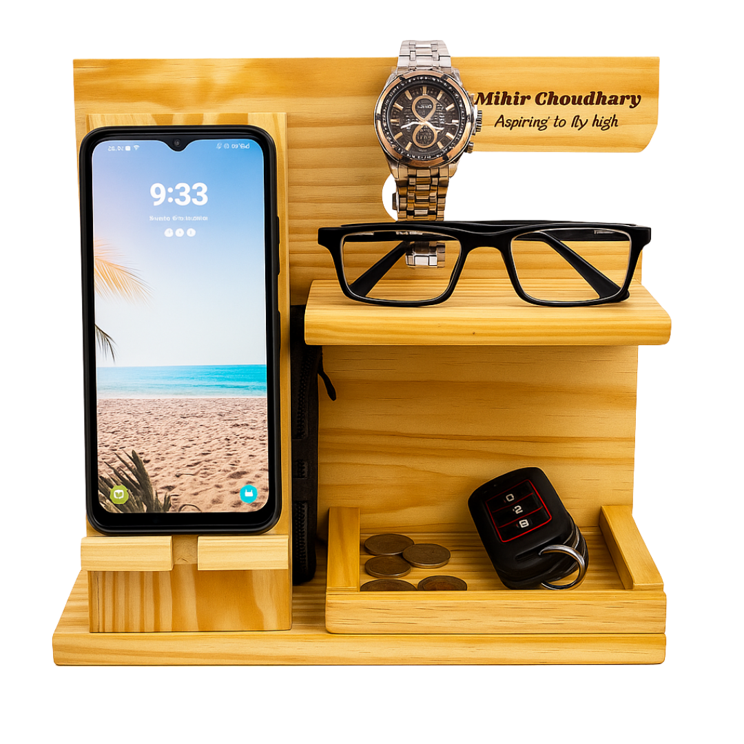 Many models include slots and cutouts specifically designed to accommodate charging cables, allowing you to power up your devices while they rest securely in place. Some versions also feature compartments for pens, sunglasses, rings, and even a space for your wallet or coins. This makes a pine-wood-docking-stationnot only a stylish organizer but also a time-saving tool for busy mornings.
