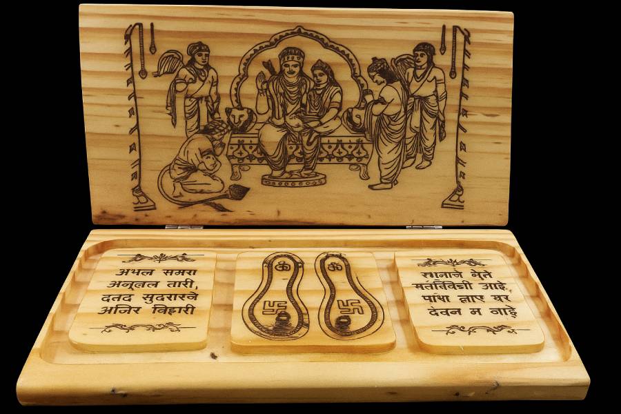 This exquisite wooden box, crafted from high-quality pine wood, features a beautifully detailed image of Ram Darbaar, the sacred mantra, and a depiction of Ram Mandir on the top—symbolizing harmony, peace, and divine energy. The fine craftsmanship brings each element to life, making it an exceptional piece for your personal altar or sacred space.