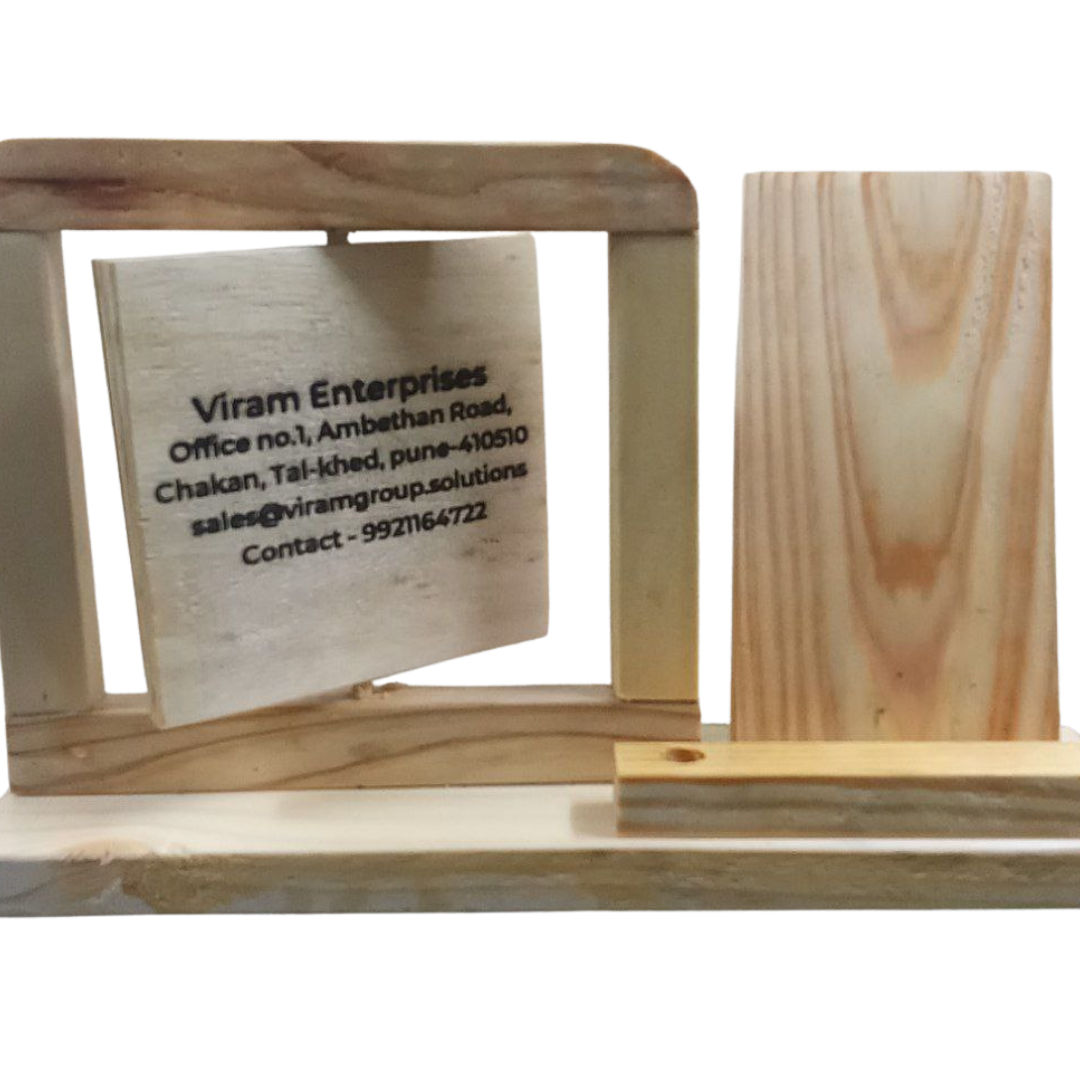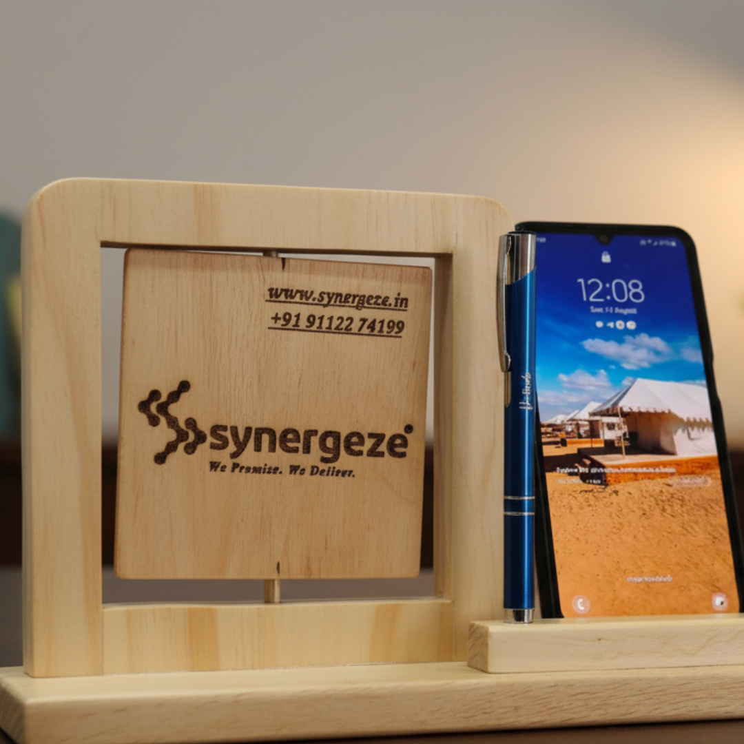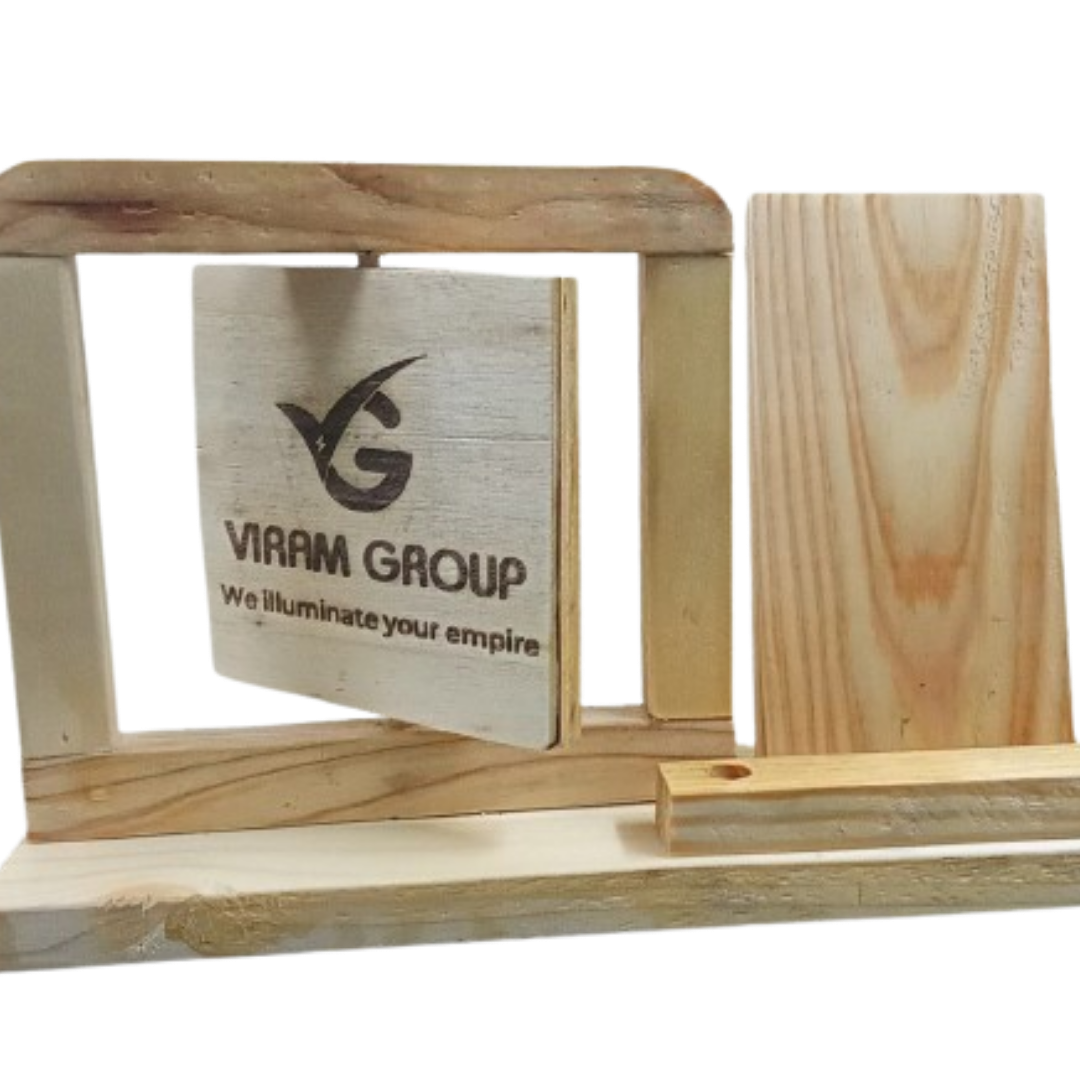 Handcrafted wooden desk organizer featuring a rotating engraved business sign, a phone stand, and a pen holder slot.Rotating Plate Corporate Gifting Mobile Stand