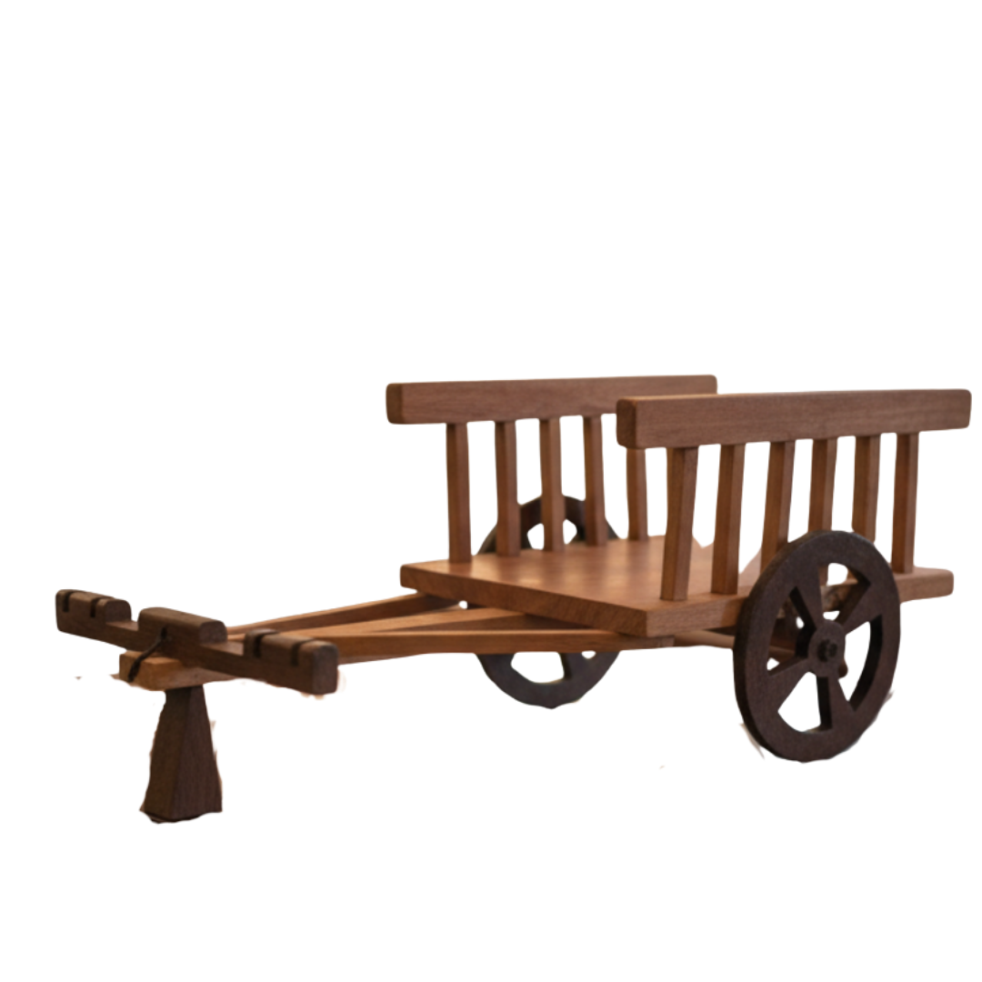 Handcrafted wooden bullock cart model with dark brown wheels and polished finish, displayed on a white surface.Transcento Décor Pallet Wood Village Bullock Cart